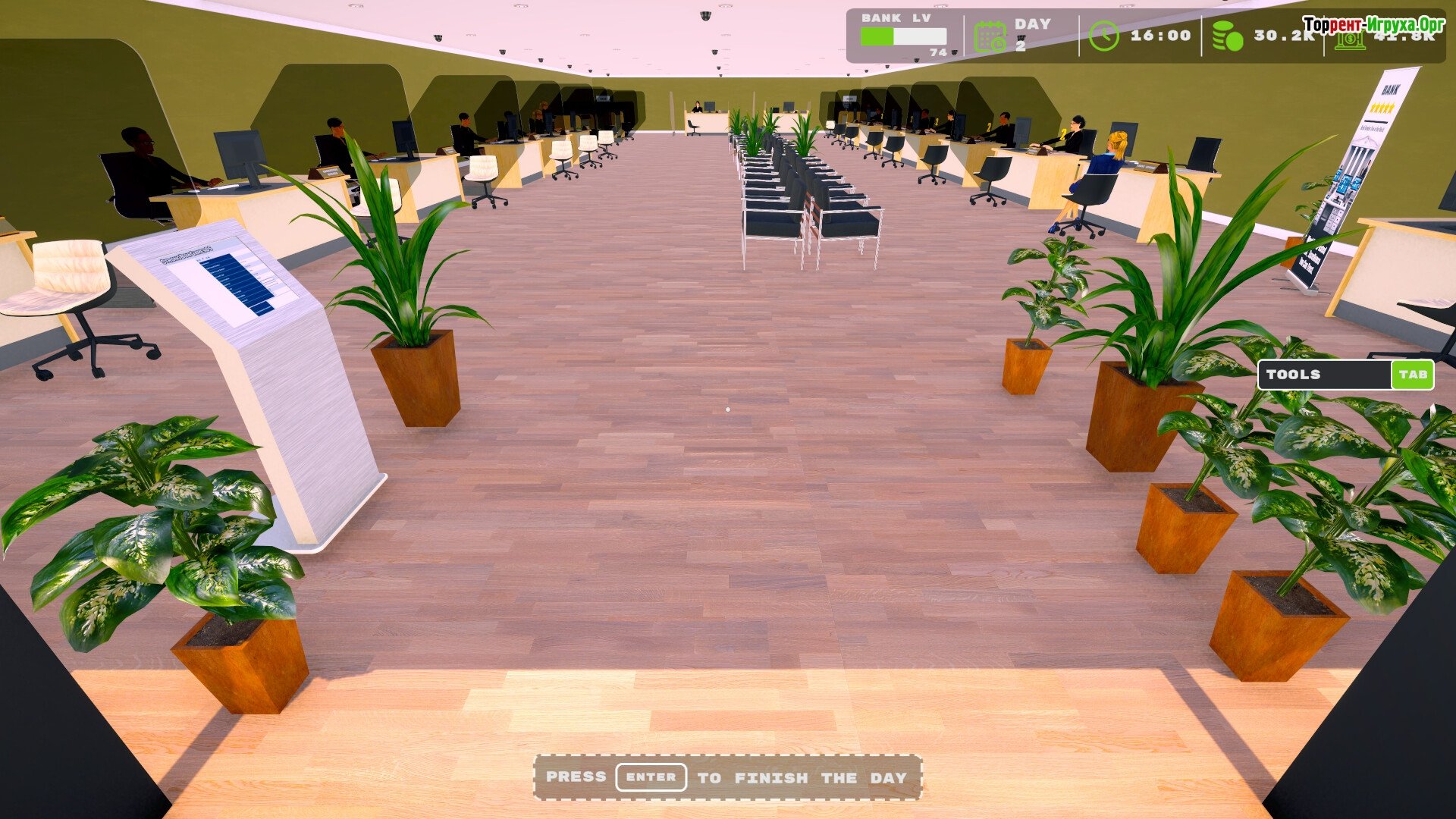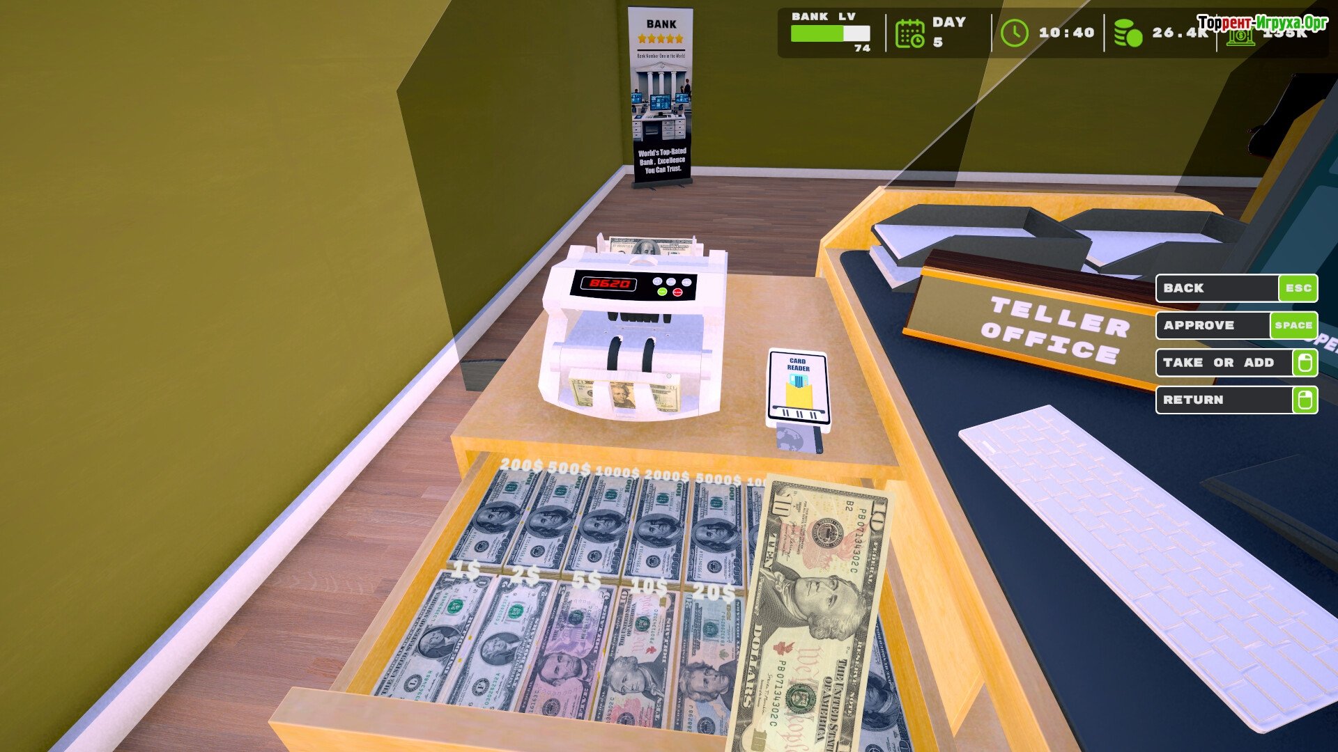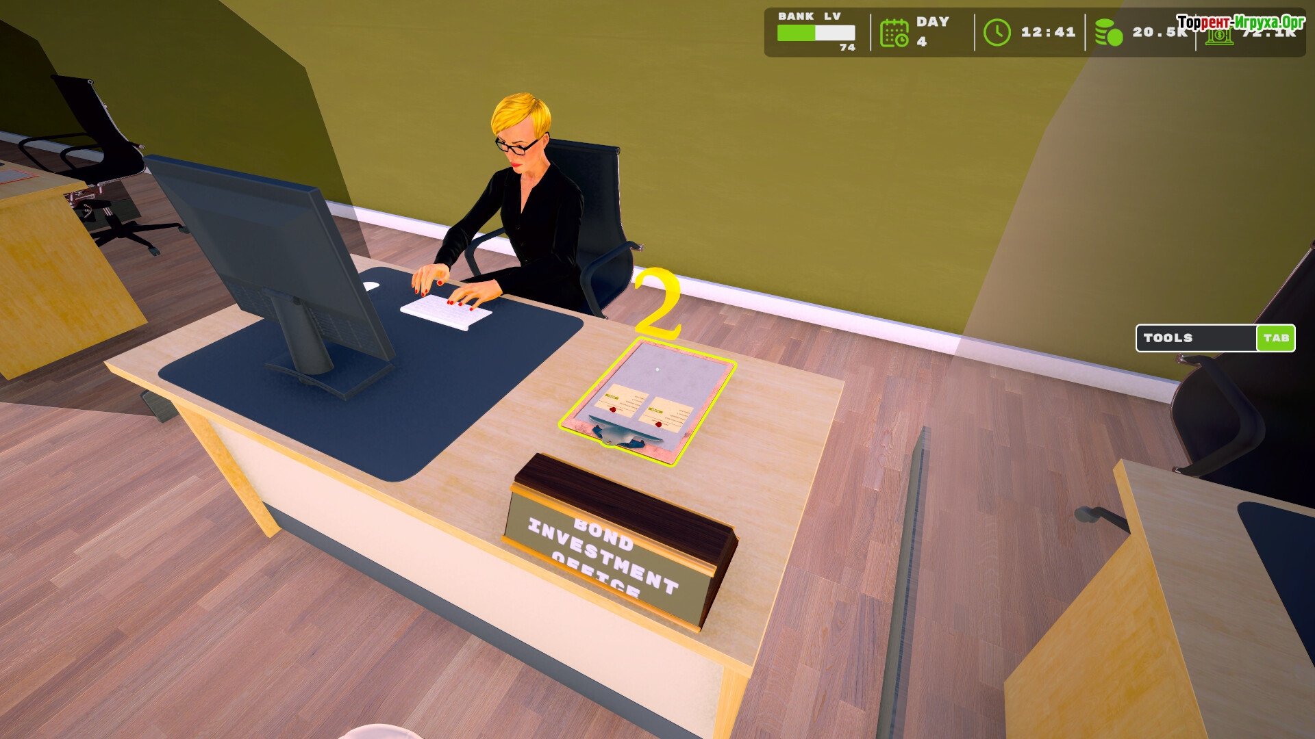 Деньги – ваш ключевой инструмент В игре вам предстоит нанимать сотрудников, эффективно управлять офисом и проводить различные банковские операции: прием вкладов, снятие средств, открытие счетов. Для отслеживания задач используйте планшет, инвестируйте средства в облигации, принимайте стратегические решения по выдаче кредитов и активно развивайте клиентскую базу.