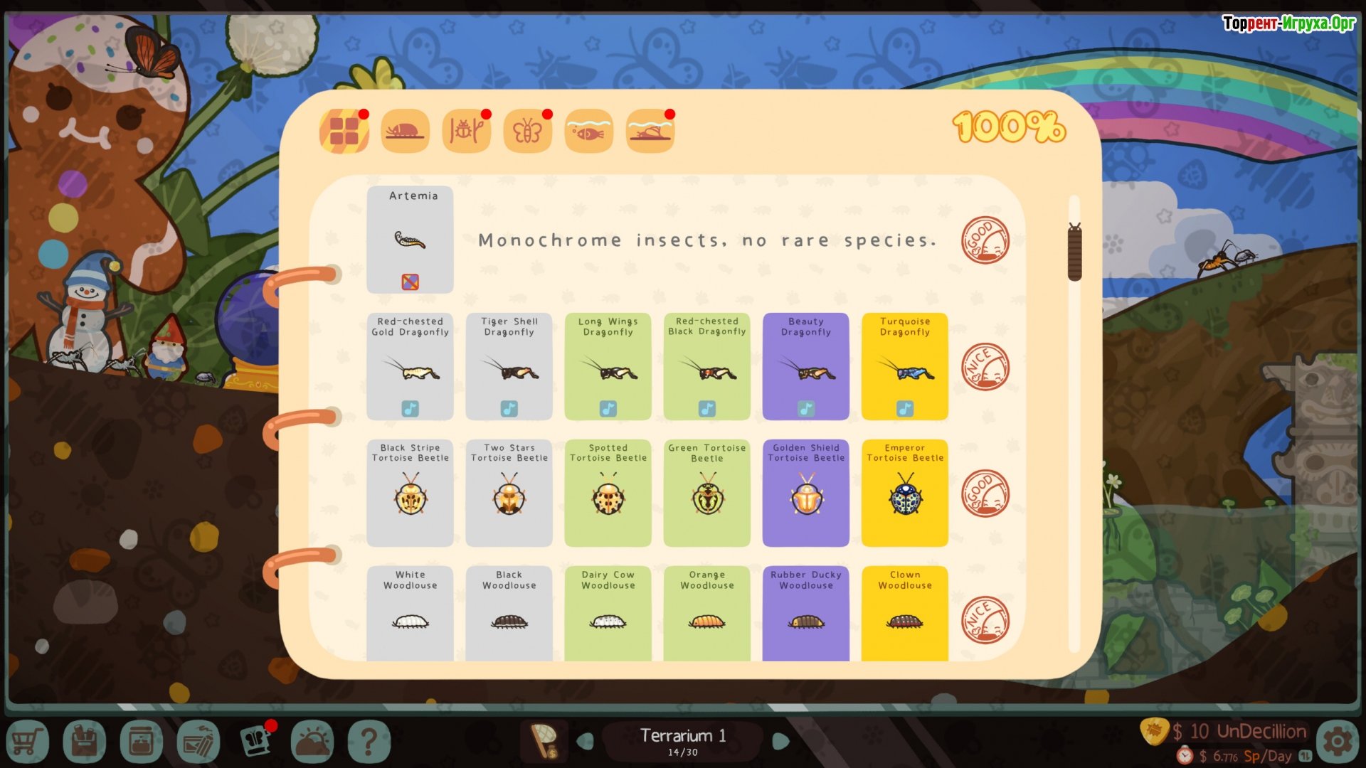* Более 300 видов жуков, каждый из которых обладает уникальным внешним видом и поведением. * Развитая система скрещивания, позволяющая получить редкие, и даже вымершие виды. * Полная свобода в настройке террариумов, предлагающая тысячи различных комбинаций. * Успокаивающий темп, расслабляющая музыка и возможность удовлетворить свой энциклопедический интерес.Другие игры