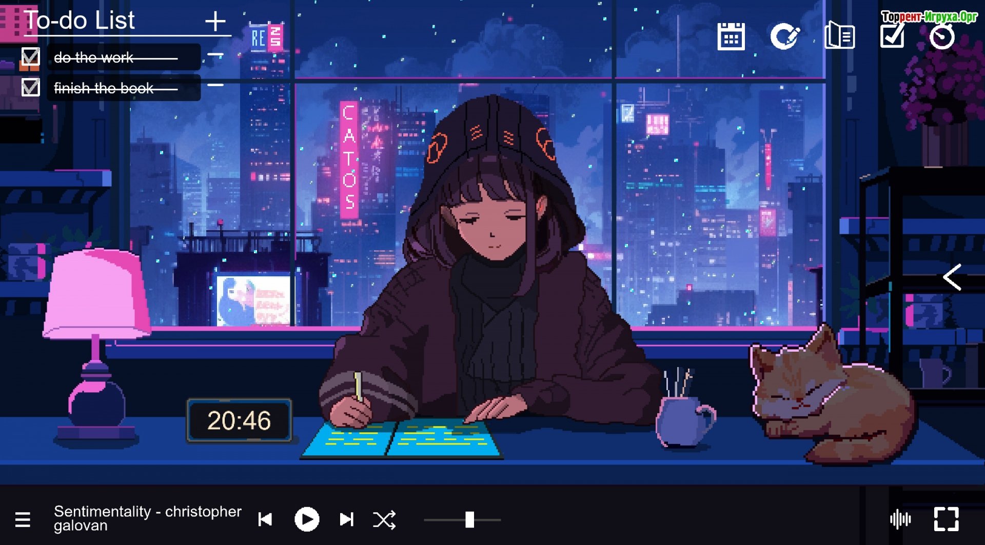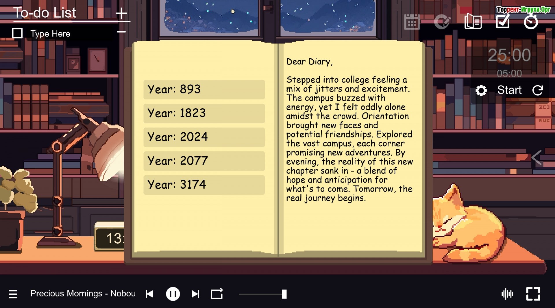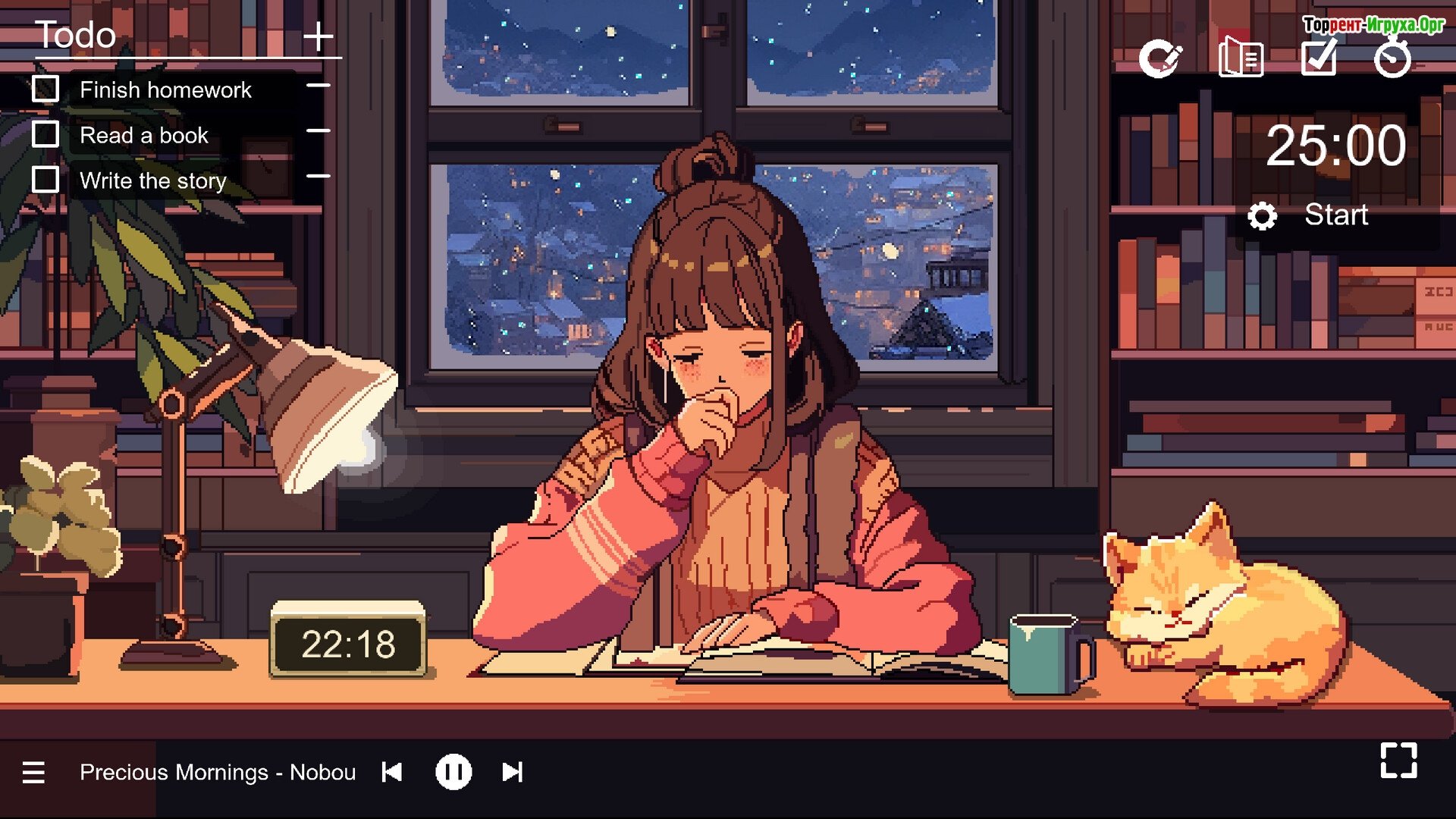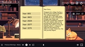 Игровой сюжет: Продуктивность гармонично сочетается с глубоким погружением в мир. Погрузитесь в учебу или работу, отправляясь в увлекательное путешествие сквозь время и пространство. Ваше приключение начнется с оживленного городка, затем вы окажетесь в спокойной древней эпохе, а завершится умиротворенной современной хижине.