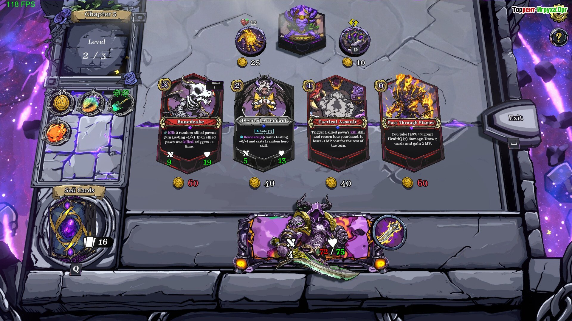 ## Ключевые особенности игры * Roguelike-забеги с постоянно меняющимися событиями. * Создание мощных армий пешек и формирование разрушительных комбо. * Смертоносные комбинации из карт и реликвий, требующие стратегического мышления. * Разблокировка новых героев и разнообразных стилей игры для расширения возможностей.