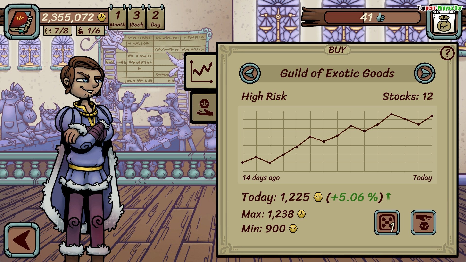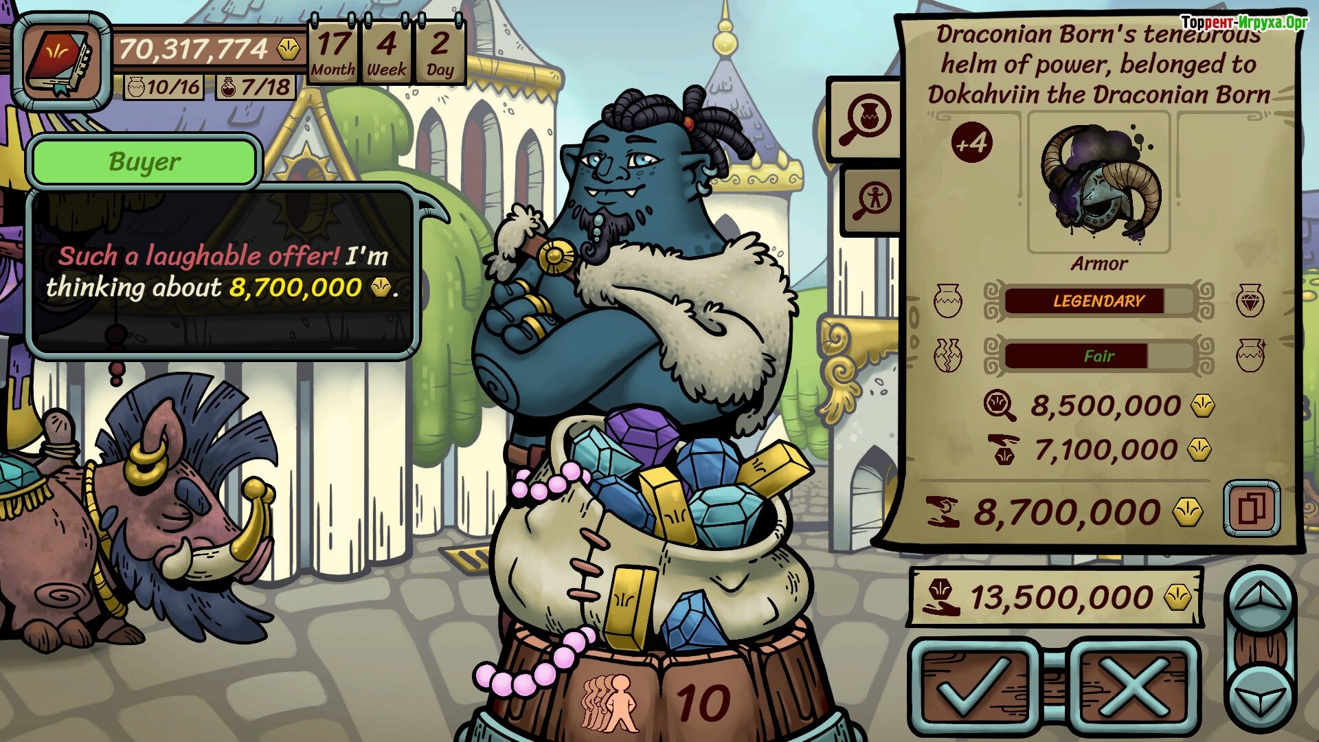 ## Базар начинается с вас Вы отправляетесь в путешествие от города к городу, неся с собой лишь мешок барахла и мечту о несметных богатствах. Каждый клиент – это новая, загадочная головоломка: стоит ли обманывать его, приобрести товар по минимальной цене или, напротив, выставив его на продажу, получить максимальную прибыль. Порой это будет древний маг, а порой – шаловливый парень в капюшоне, держащий в руках “настоящий” легендарный меч. Не спешите заключать сделку, тщательно проверяйте все.