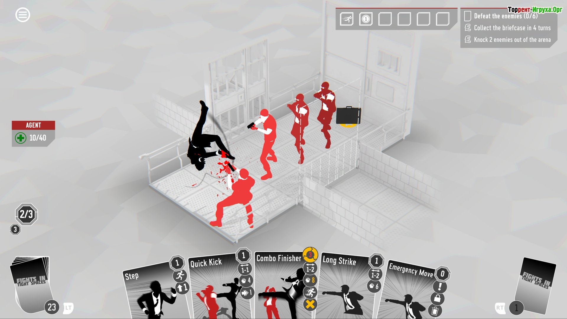 Как вы, вероятно, уже поняли, ключевым преимуществом в вашем приключении станет огромный выбор разнообразных карт. Например, достаточно будет воспользоваться доступными вариантами действий и грамотно их распределить во время схватки. Если вы все сделаете правильно – вас ждет успех, а в противном случае – поражение. Для каждого уровня будет предложен свой уникальный набор карт с различными действиями, из которых вам предстоит выбирать. Иногда условия будут крайне ограничены, а иногда у вас будет простор для маневра. Главное – всё тщательно обдумать и постараться достичь наилучшего результата. Чтобы начать оттачивать свои навыки, скачайте торрент Fights in Tight Spaces на ПК и начинайте подготовку к сражениям!