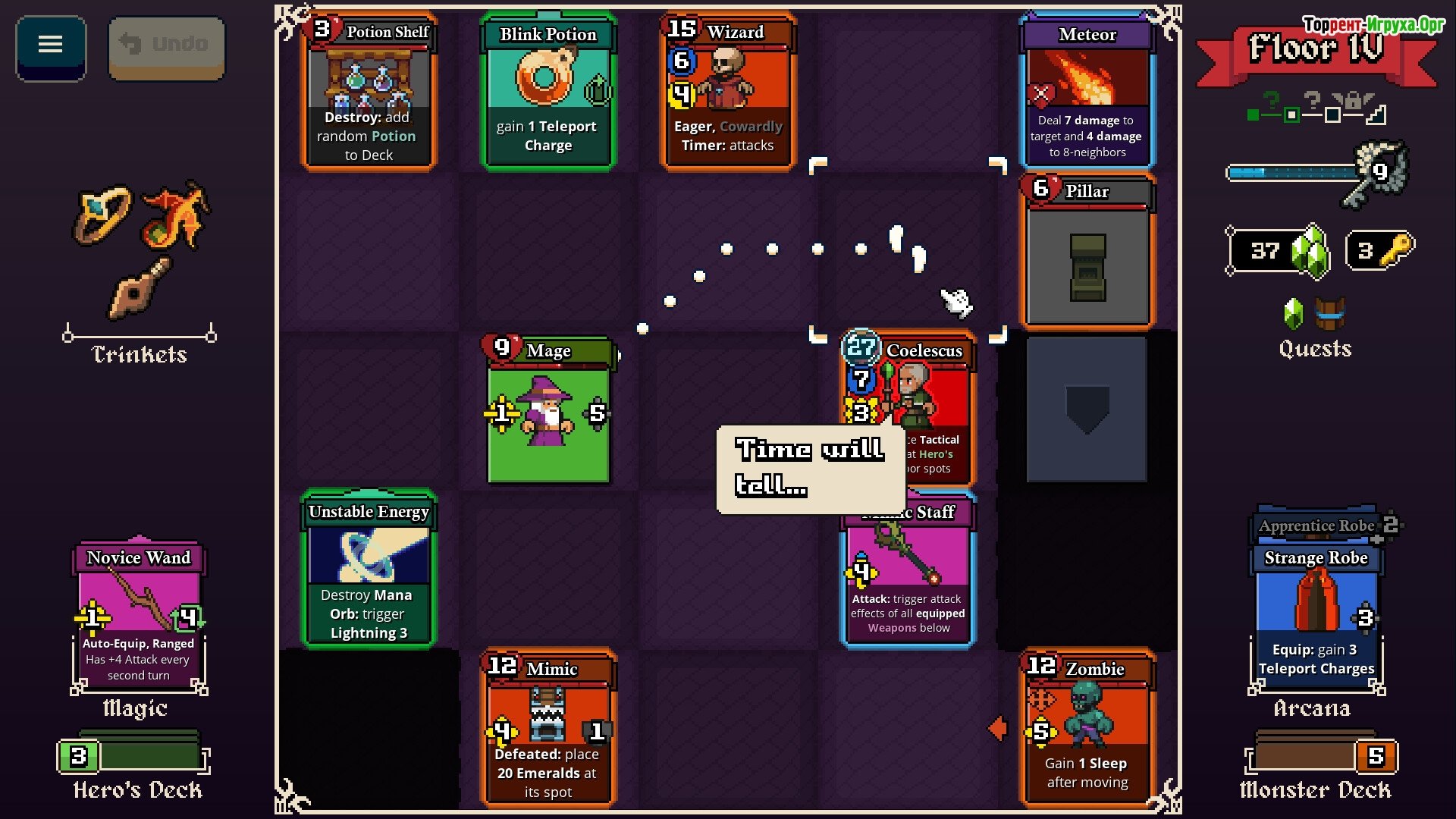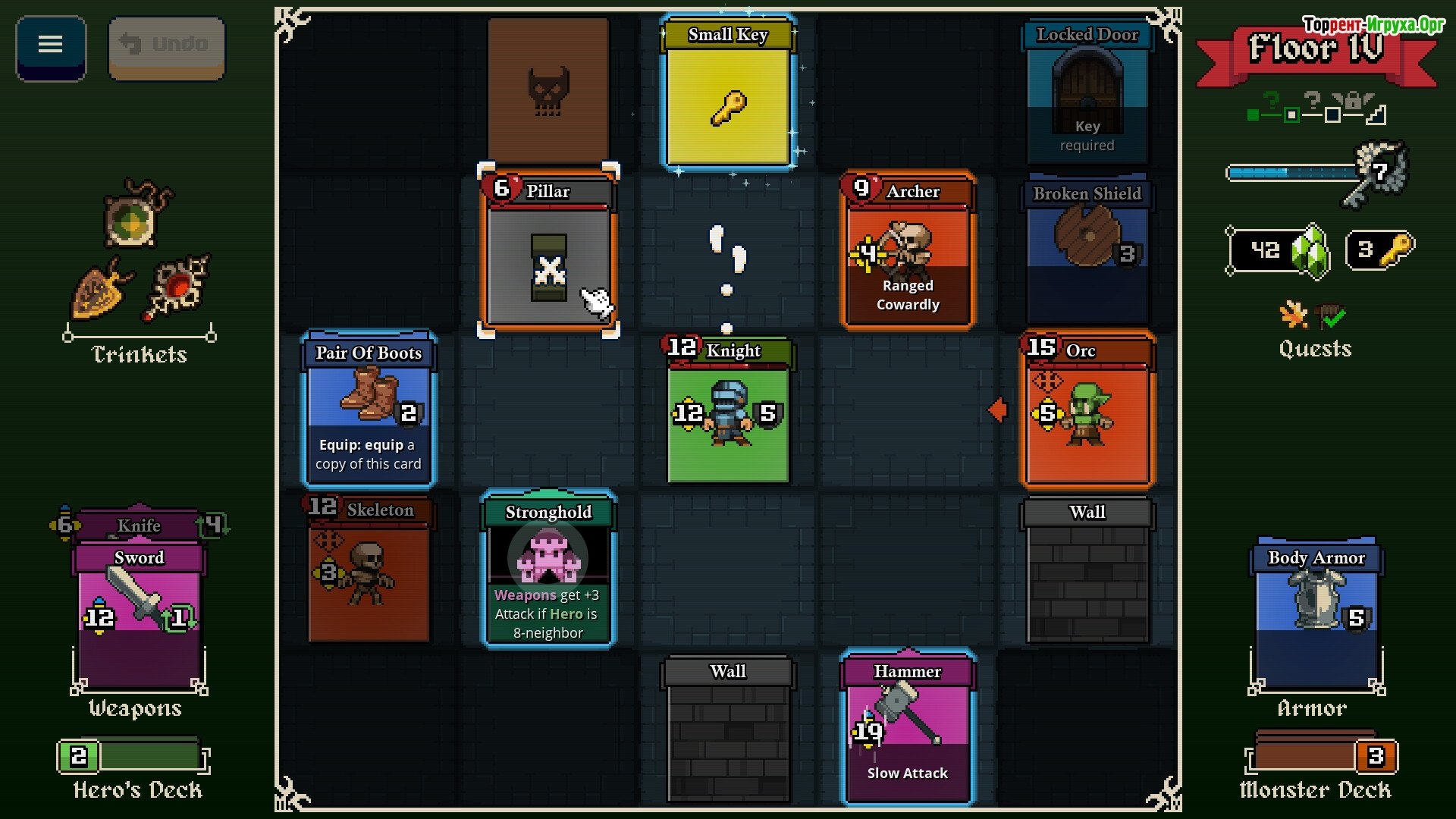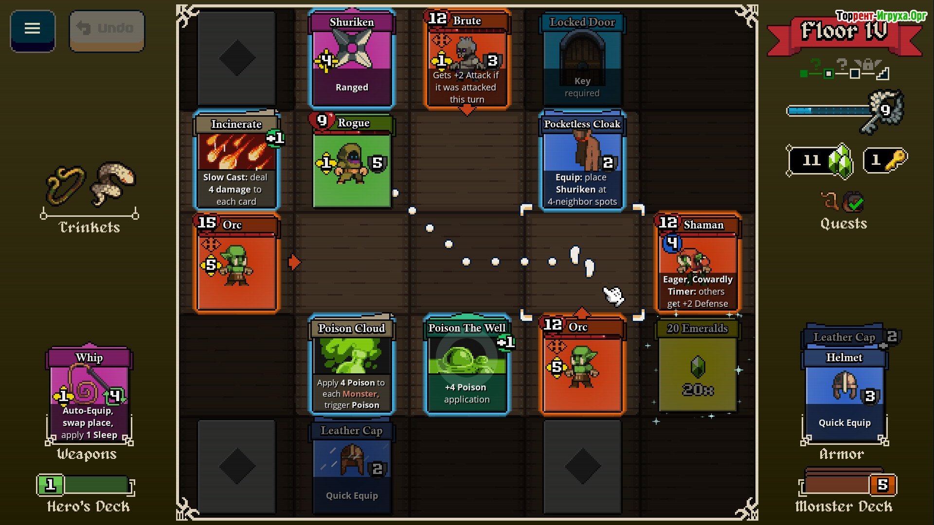 Между этажами подземелья вы также можете улучшать свои карты и снаряжение, создавая мощную колоду, способную противостоять всё более опасным врагам. Исследуйте, комбинируйте карты и выстраивайте колоду, которая соответствует вашему стилю игры.