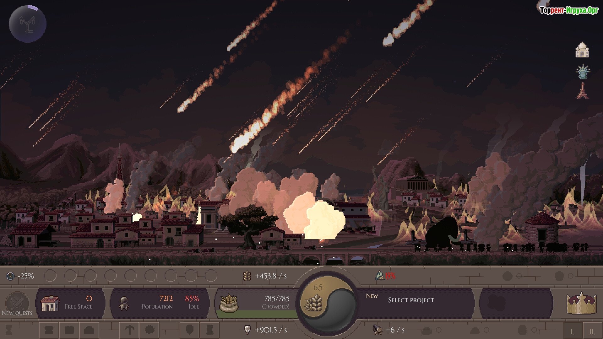 Микроцивилизация – это уникальное сочетание пиксельной стратегии и классического кликера, где вы будете исследовать мир, постепенно расширяться и развивать свое влияние, а затем, по желанию, разрушать все вокруг. Сможете ли вы справиться с этой задачей?