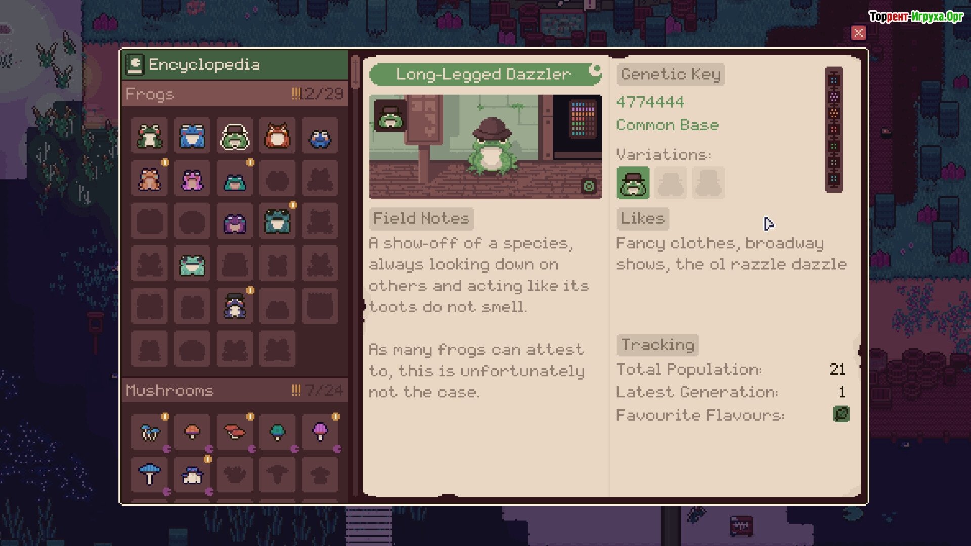 ## Магия природы и эксперименты Восстановите исчезнувшую популяцию лягушек в своем пруду, применяя генетические эксперименты. Игроку предстоит решать сложные головоломки, требующие не только изучения генетики, но и решения задач по восстановлению самой экосистемы. Используйте созданные вами виды лягушек для открытия новых путей и механик, познавая все чудеса природы.