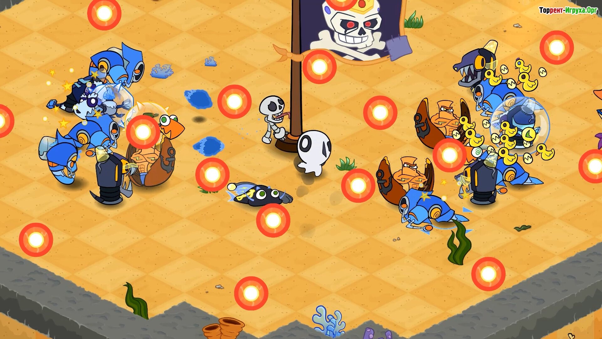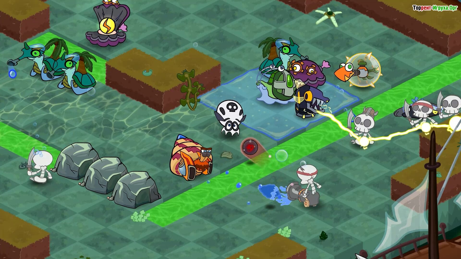 Собирайте мощные турели: креветку-пушку, милого морского котика и злобную слизистую мортиру. Не забывайте уклоняться от ядовитых фляг и избегайте попадания в опасные соляные гейзеры. Оставайтесь начеку – за поворотом может оказаться скелет-альфа с двумя мечами и крайне неприятным нравом.