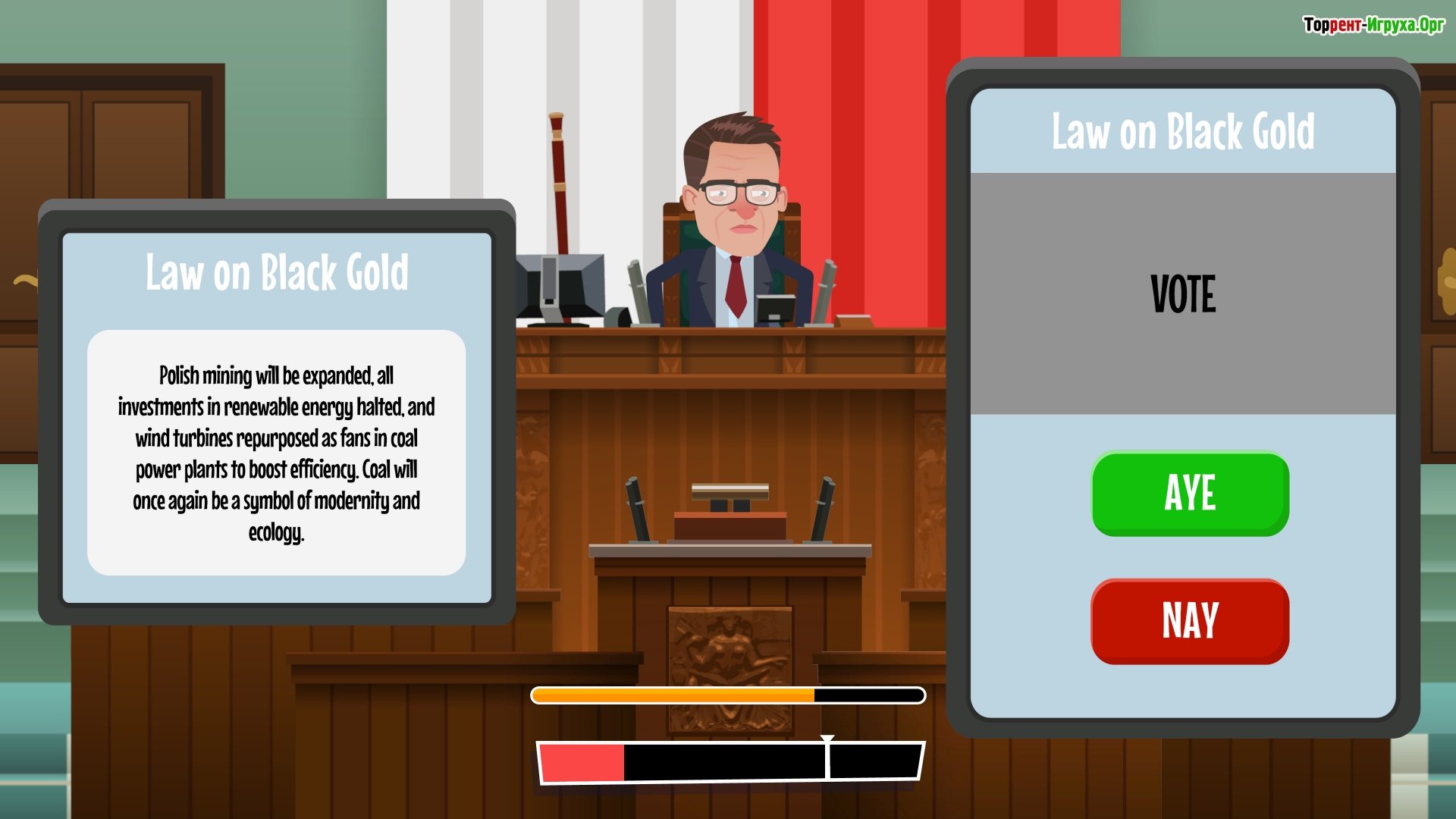 Особенности игры * Пошаговые дебаты и напряженные арены парламентских сражений. * Разветвленная система союзников, основанная на пародийных образах известных политиков. * Неограниченный юмор и сатирическая критика представленных во власти политических сил. * Сюжет, вдохновленный абсурдом современной политики.