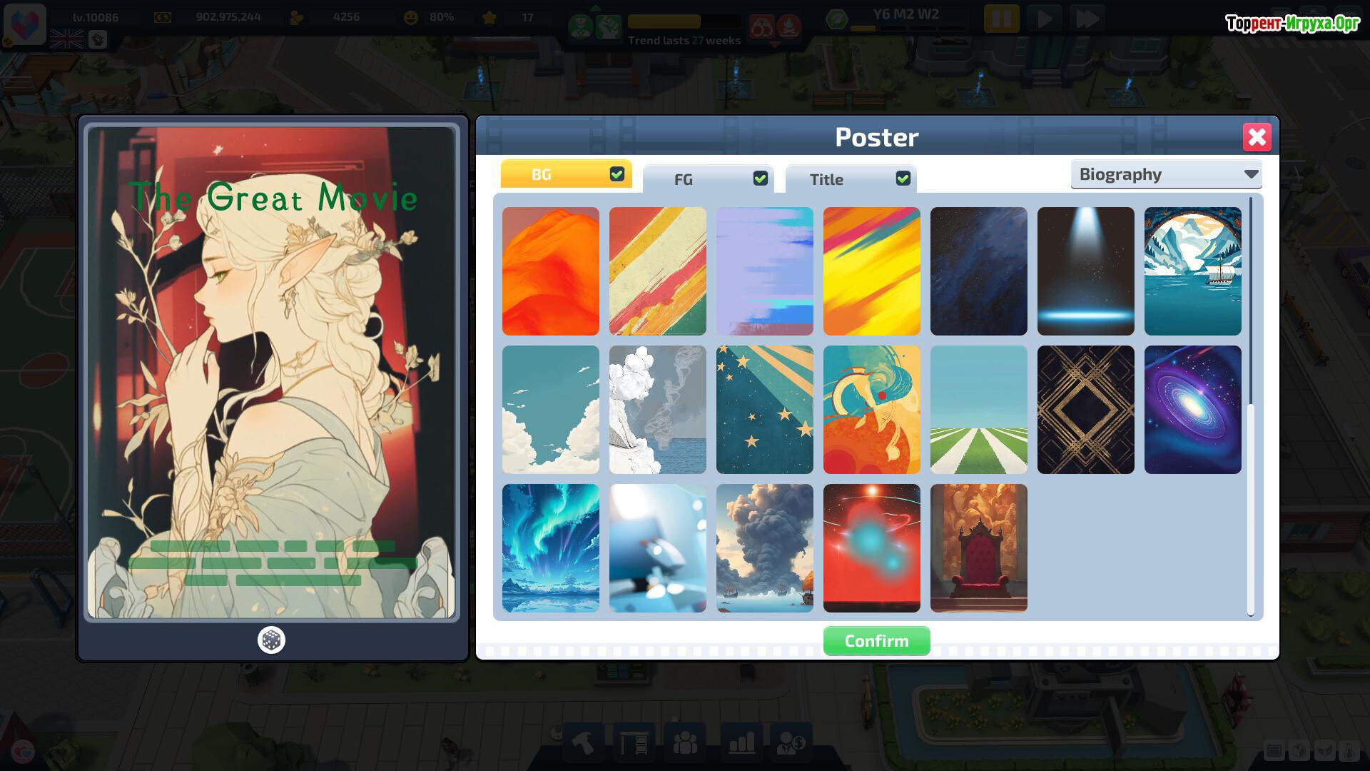 В "Super Movie Tycoon" вам предстоит построить свою киноимперию, превратив пустой участок земли в легендарную киностудию. От написания первых сценариев и съемок небольших фильмов до создания блокбастеров, собирающих миллиарды, дорога к вершине славы будет полна как творческих свершений, так и продуманных стратегий. В этом симуляторе кино — это бизнес, где успех зависит от баланса вдохновения и дисциплины.