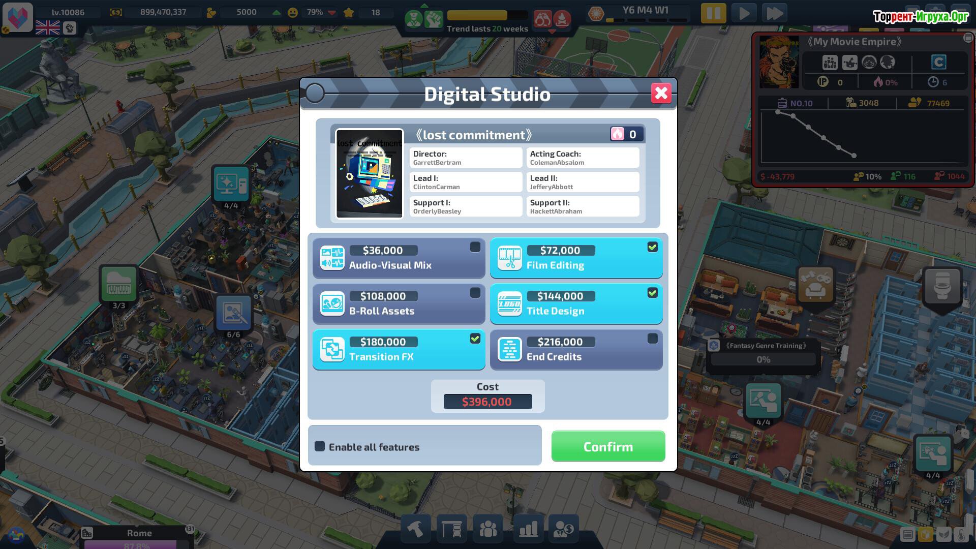 Возводи павильоны, звуковые студии, лаборатории и офисы. От рождения идеи до выхода на экраны — вы руководите всем процессом создания фильма. От выбора актеров до скорости съемок, от дизайна декораций до общей атмосферы — каждый этап влияет на конечный результат. Неправильное управление — и премьера обернется неудачей. Вдохновляйте команду и задавайте тон студии: будет ли это авторский проект или коммерческая картина? Фестивали, критики и зрители станут для вас индикатором успеха. Успешные фильмы принесут прибыль и новые возможности, а провалы — бесценный опыт для будущих проектов. Стремитесь к глобальному масштабу, открывая филиалы за рубежом, и будьте в курсе последних тенденций. Сфера кино не терпит бездействия — чтобы удержать лидерство, необходимо непрерывно искать новые идеи и таланты.