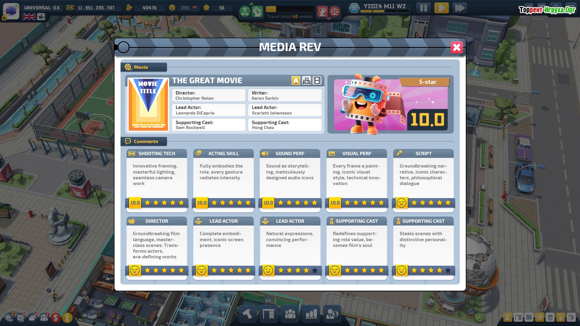 Это глубокий симулятор киностудии, где вы управляете производством и персоналом.