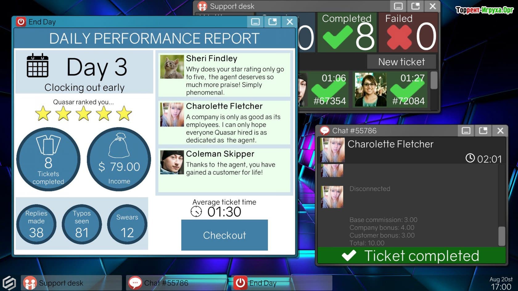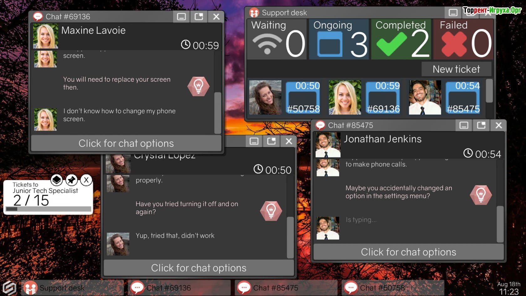 Вначале вам придется решать проблемы отдельных пользователей, которые затрудняются в применении тех или иных функций. Задачи будут начинаться с простых, но со временем усложняться. Важно уметь верно оценивать проблему и предпринимать необходимые шаги. Не теряйте драгоценное время и приступайте к выполнению своих задач. Клиентам свойственна нетерпеливость, им необходим оперативный подход к решению проблем. Скачать Tech Support: Error Unknown на русском языке через торрент можно в любое удобное время с нашего ресурса. Процесс загрузки быстрый и позволит вам незамедлительно приступить к действию. Мы уверены в ваших способностях и считаем, что вы добьетесь положительного исхода. Желаем вам приятной игры!