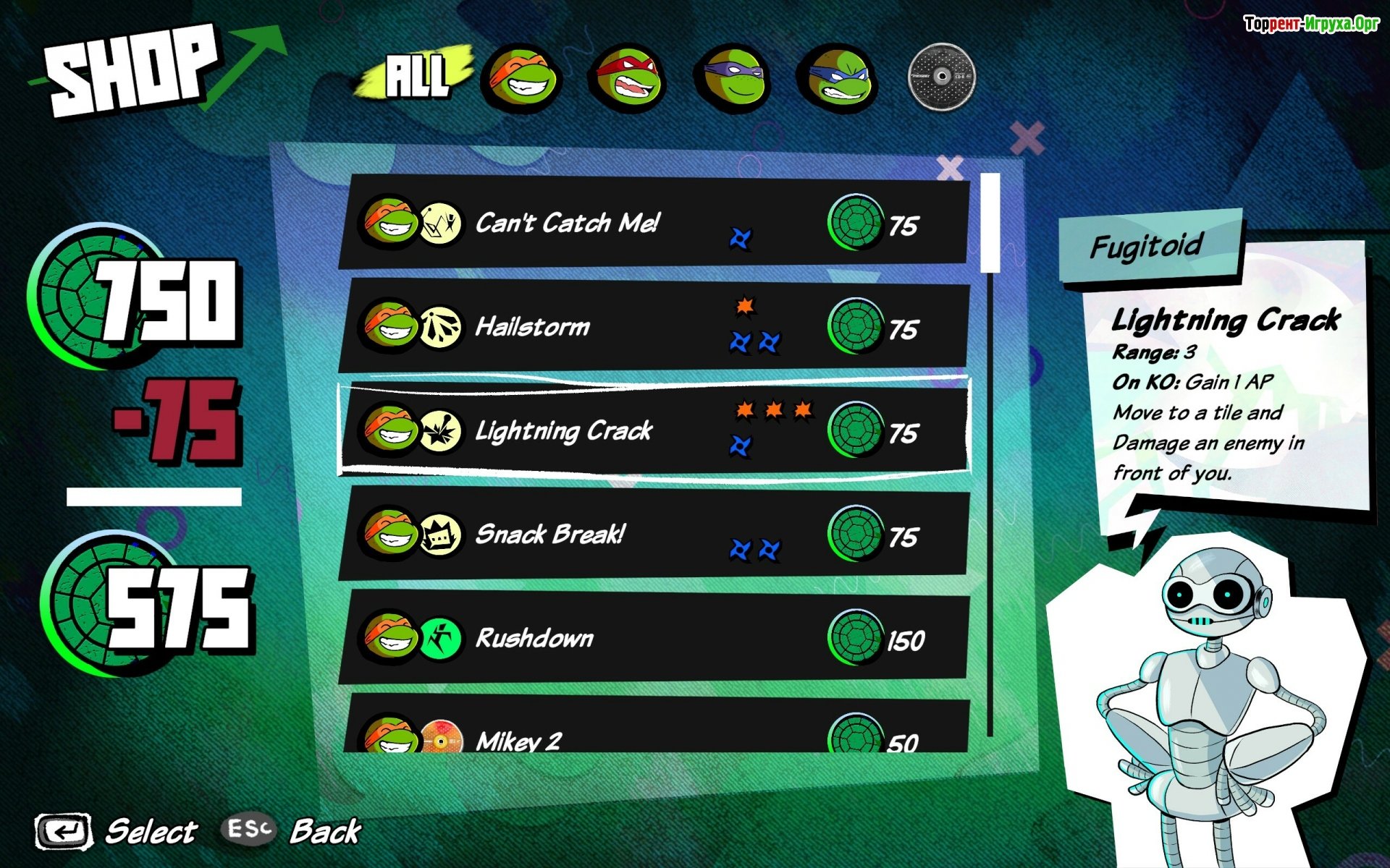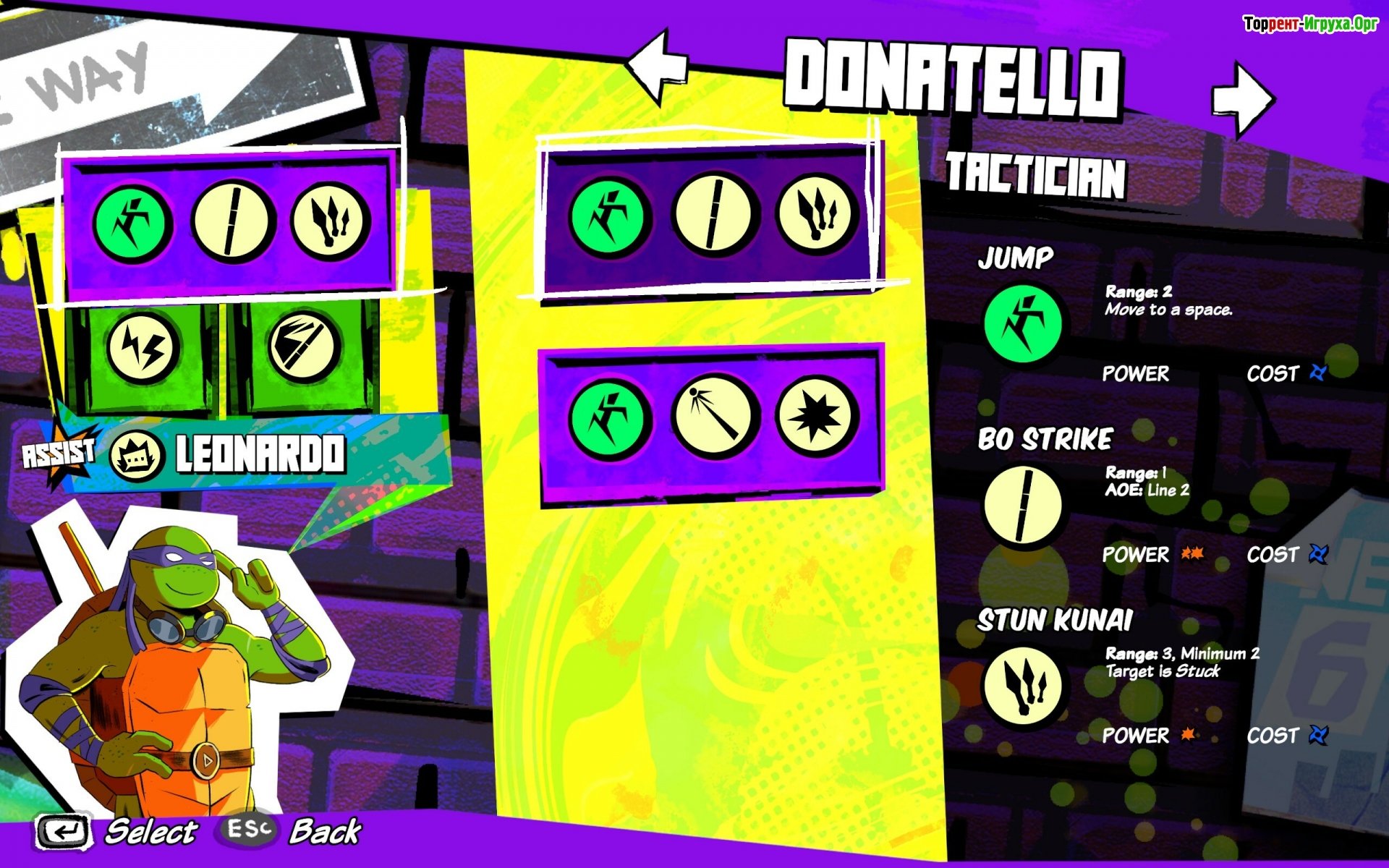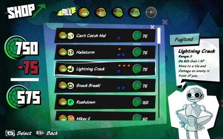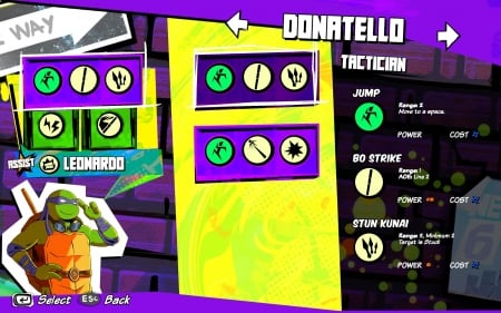 ## Особенности игры * Интенсивные пошаговые сражения с глубоким тактическим подходом. * Широкие возможности кастомизации способностей героев, позволяющие настроить их под свой стиль игры. * Знакомые злодеи и места, воссозданные из вселенной Teenage Mutant Ninja Turtles. * Захватывающая сюжетная кампания с элементами role-playing (RPG).