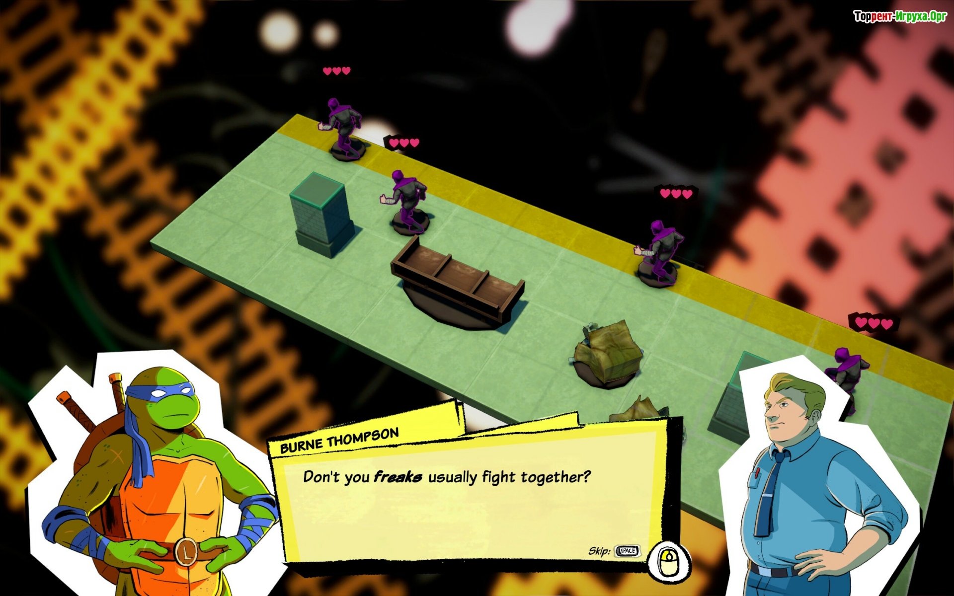 ## Битва за Нью-Йорк Клан Фут вновь представляет угрозу, и именно черепашки-ниндзя стали последней надеждой. Вам предстоит тщательно продумать каждый шаг, чтобы максимально эффективно использовать навыки Леонардо, Рафаэля, Донателло и Микеланджело. От мощных атак и непосредственно поддержки команды – каждая способность имеет своё место в бою.