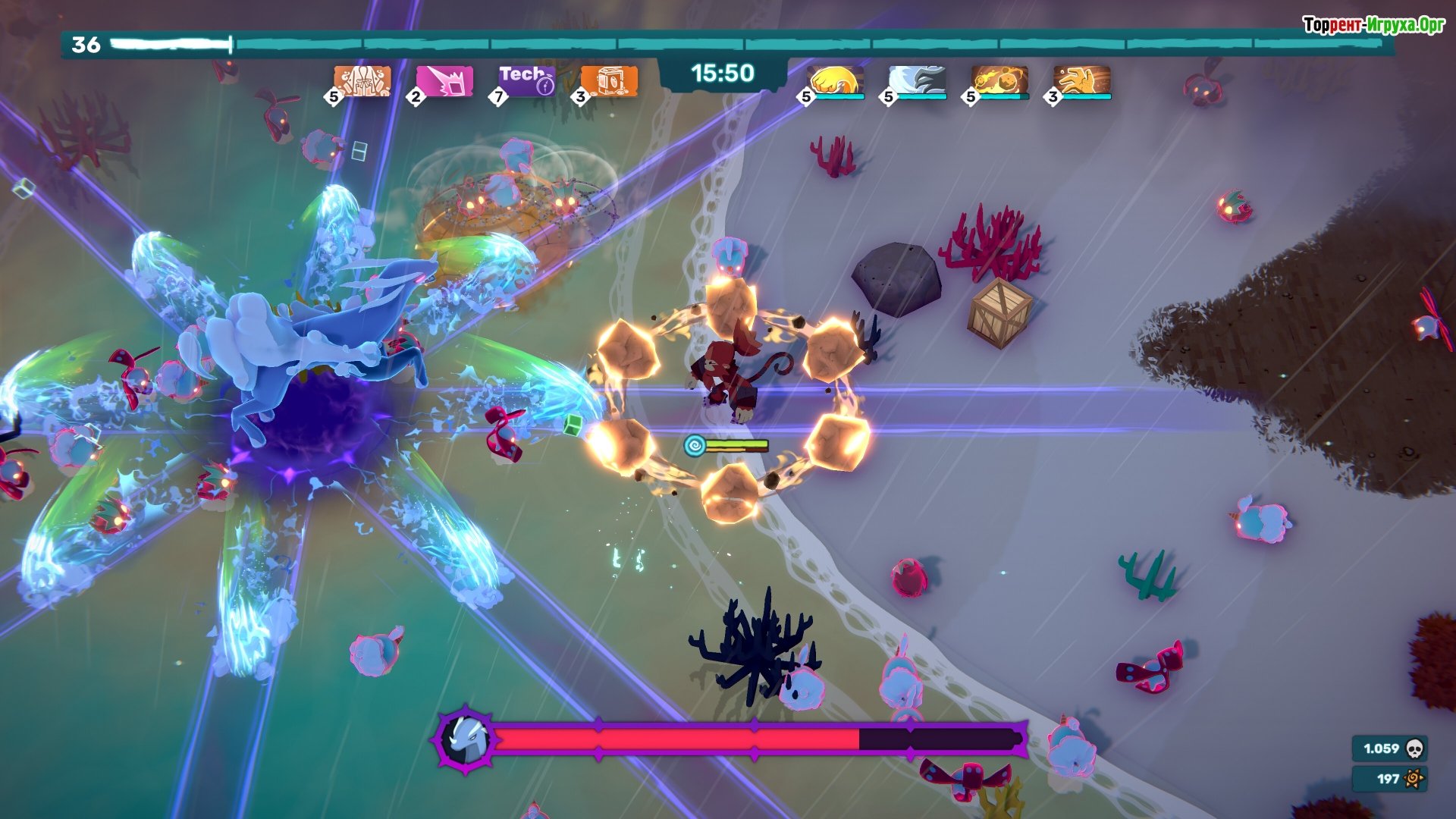 Не забудьте также побеждать огромных боссов в этом динамичном шутере в стиле "bullet heaven" и выживать в сложных ситуациях.