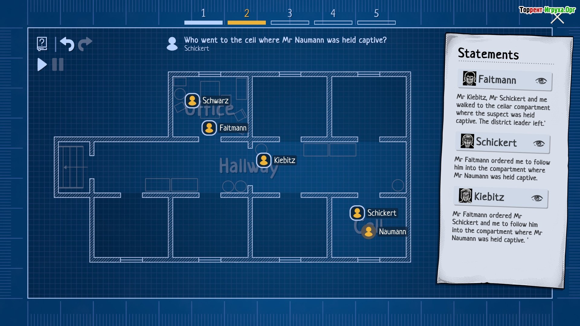## Расследование, анализ и выводы В этой игре вам предстоит собрать огромное количество фактов, помогающих добиться желаемого результата и выявлять подозреваемых. Как только факты будут найдены, можно приступать к допросам. Во время допросов вы будете наблюдать за человеком и выбирать, какие вопросы задавать. Не забывайте о всех собранных фактах, так как именно они позволяют задавать наиболее интересные и запутанные вопросы. Главное – не спешить и постепенно разоблачать нацистов. Стоит помнить, что некоторые факты могут оказаться ложными или скомпрометированными, и потребуется дополнительное расследование для их проверки.