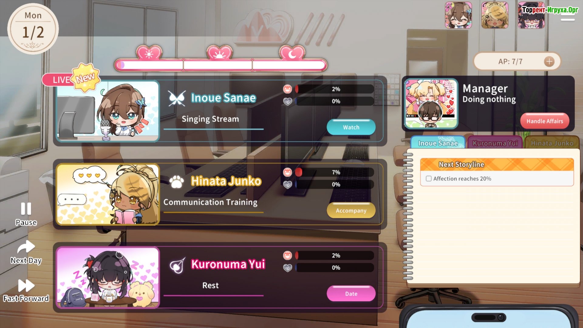 Вы – новичок, неожиданно попавший в роль менеджера в Big Mountain Production. Каждый день – это череда расписаний, активного продвижения и захватывающих трансляций. Но за их яркими цифровыми аватрами скрываются настоящие девушки, у каждой из которых есть свои собственные мечты и уязвимости. Ваша задача – управлять их карьерой и, несомненно, их сердцами.