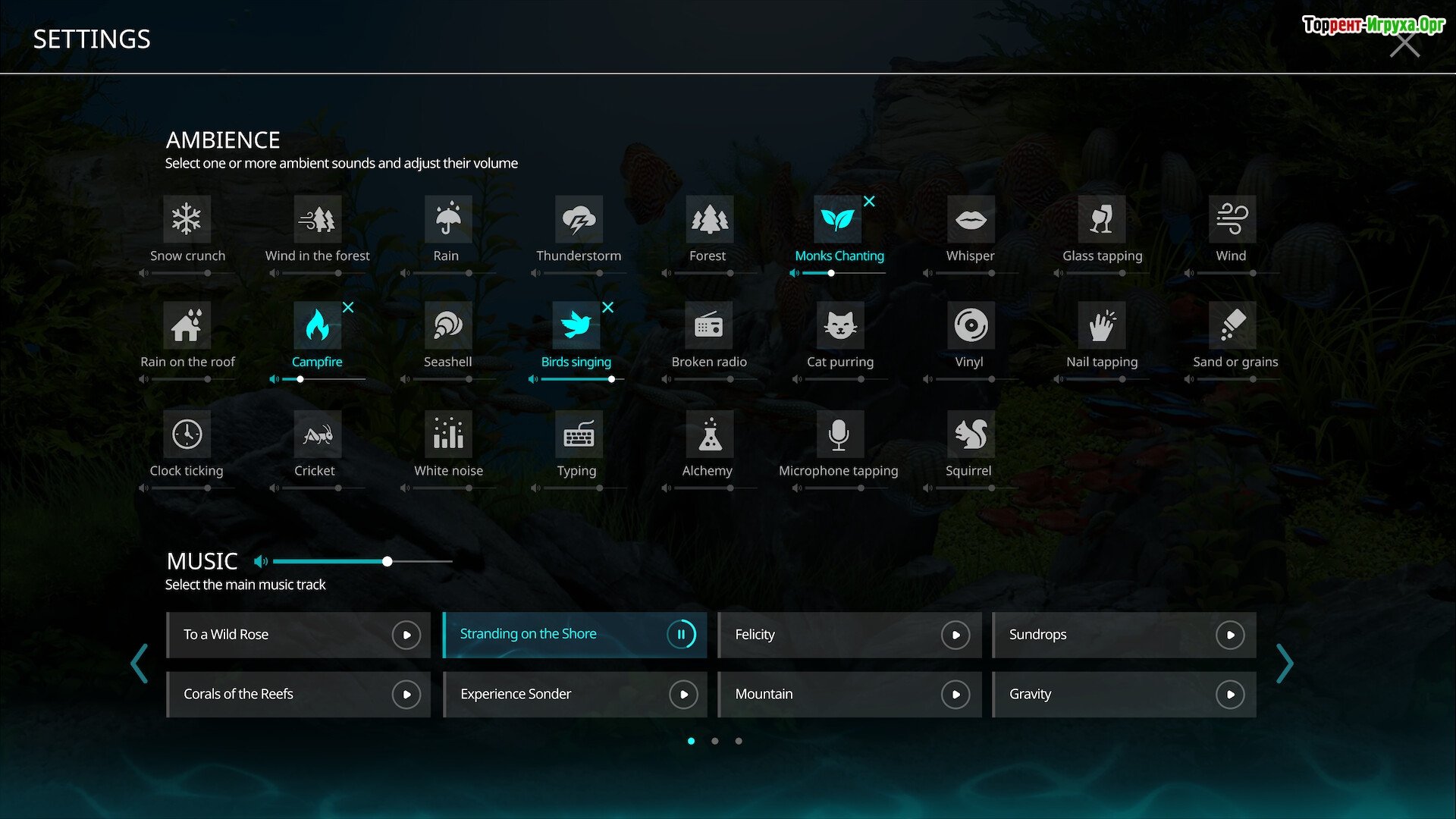 ## Особенности игры * Медитативный idle-опыт с добавлением элементов высококачественного звукового дизайна. * Уникальная система наложения природных звуков и музыкальных эффектов для создания атмосферы. * Интерактивная визуализация в минималистичном стиле, имитирующая аквариум. * Интеграция ASMR и других эффектов, способствующих развитию осознанности и глубокому расслаблению.